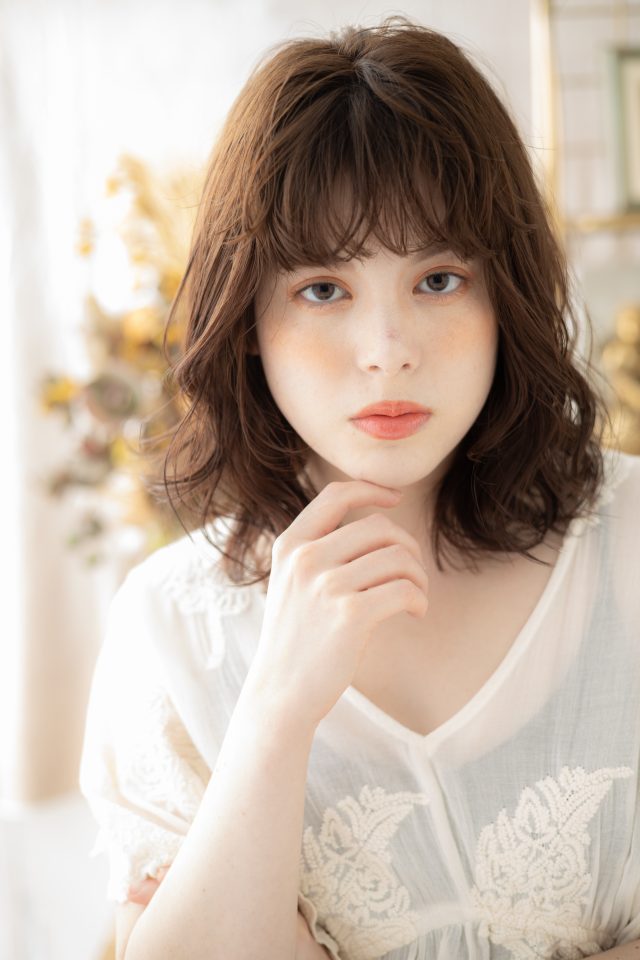 くせ毛風ゆるふわエアリーミディや耳かけ前下がりも大人かわいい。斜めバング厚めバング、シースルーバングかきあげ前髪で小顔。切りっぱなしボブミニボブ、大人ボブ前下がりボブも人気。(メイク担当:川口店伊与田)