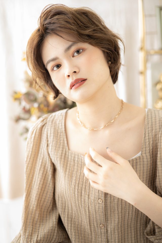 ナチュラルボブフェミニンボブ、大人ボブ前下がりボブの伸ばしかけに。斜めバング厚めバング、シースルーバングかきあげ前髪で小顔。くせ毛風ゆるふわミディや耳かけ前下がりウルフも人気。(メイク担当:川口店伊与田)