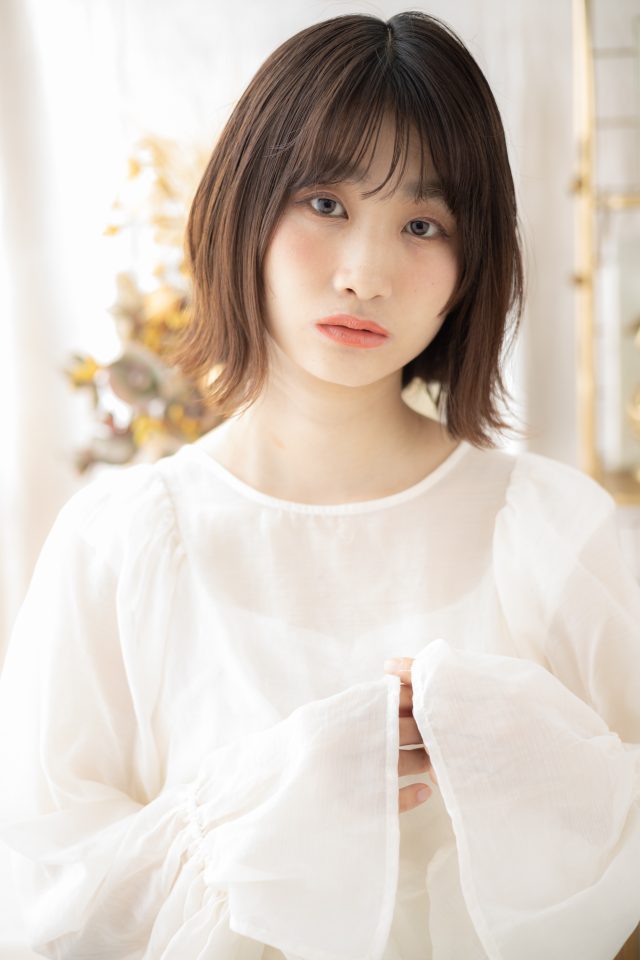 大人ボブ前下がりボブ、ナチュラルボブフェミニンボブも人気。斜めバング厚めバング、シースルーバングかきあげ前髪で小顔。くせ毛風ゆるふわミディや耳かけ前下がりウルフも大人かわいい。(メイク担当:川口店岩渕)