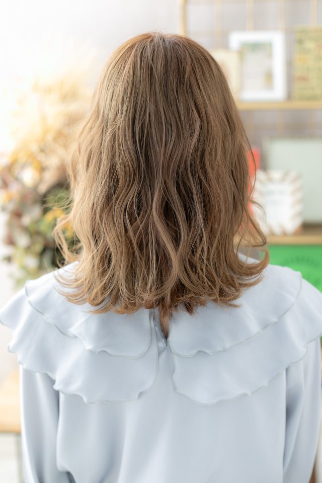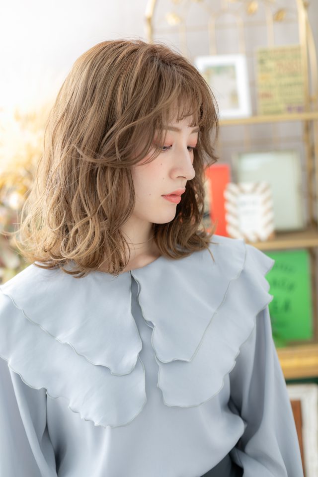 インナーカラーやイヤリングカラーで外国人風。エアリーミディやくせ毛風ゆるふわミディ、耳かけ前下がりウルフも大人かわいい。斜めバング厚めバング、シースルーバングかきあげ前髪で小顔。(メイク担当:川口店伊与田)