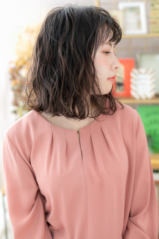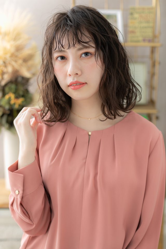 前髪パーマと外国人風カールが大人かわいいエアリーミディ。ミニボブナチュラルボブ、大人ボブ前下がりボブからイメチェンに◎斜めバング厚めバング、シースルーバングかきあげ前髪で小顔。(メイク担当:川口店岩渕)