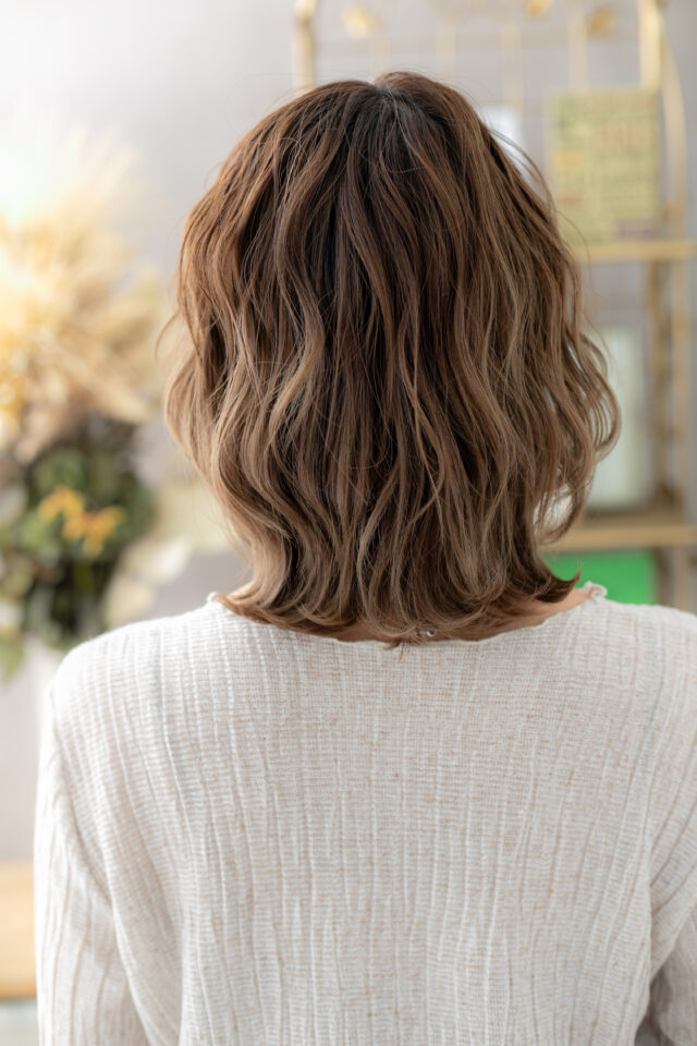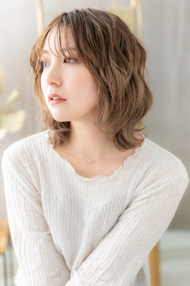 バレイヤージュ/ハイトーンカラー/くせ毛風/ゆるふわ/ナチュラルボブ/フェミニンボブ/ふわミディ/大人ハイライト/韓国風/ボブ/ウェットヘア/ウルフ/耳かけ/前下がり/くびれショート/エアリーミディ/ナチュラル/20代/30代/40代