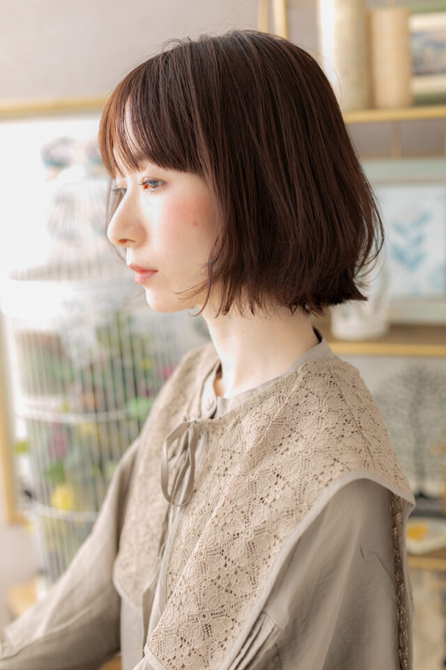 丸みショートやマッシュショート、くびれショートから伸ばしかけに。斜めバングシースルーバング、かきあげ前髪ぱっつん前髪で小顔。くせ毛風ゆるふわミディやエアリーミディも大人かわいい。(メイク担当:北浦和店成田)
