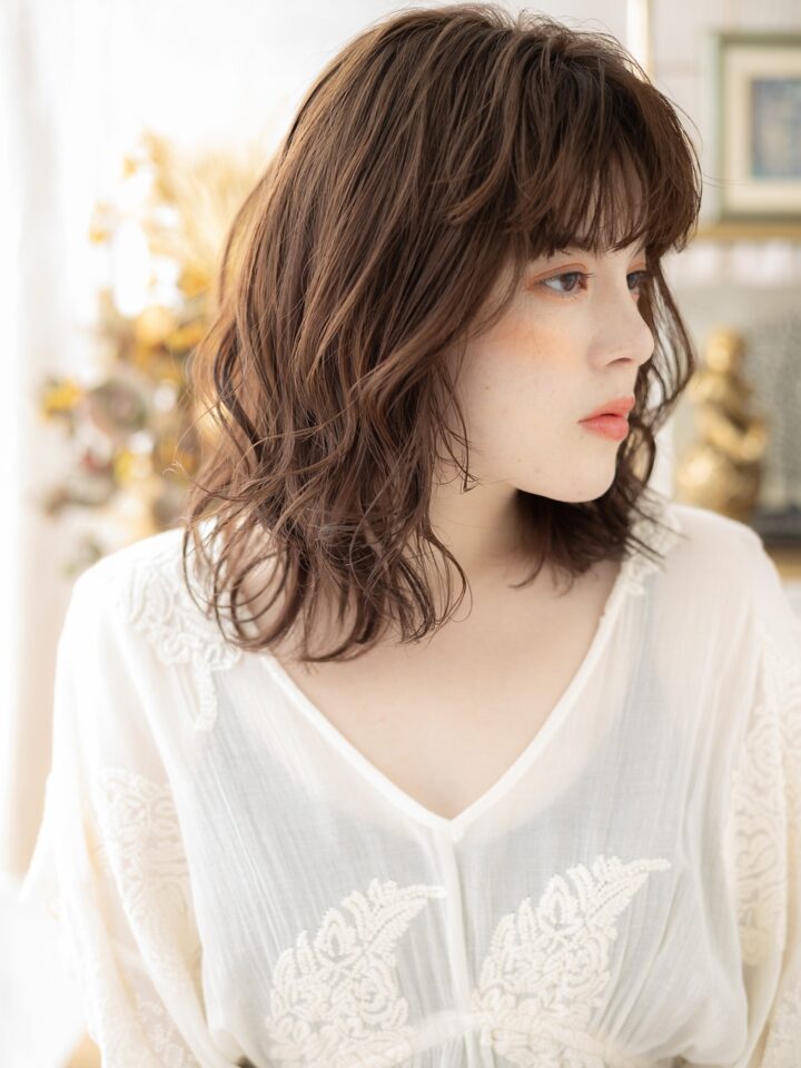 くせ毛風ゆるふわエアリーミディや耳かけ前下がりも大人かわいい。斜めバング厚めバング、シースルーバングかきあげ前髪で小顔。切りっぱなしボブミニボブ、大人ボブ前下がりボブも人気。(メイク担当:川口店伊与田)