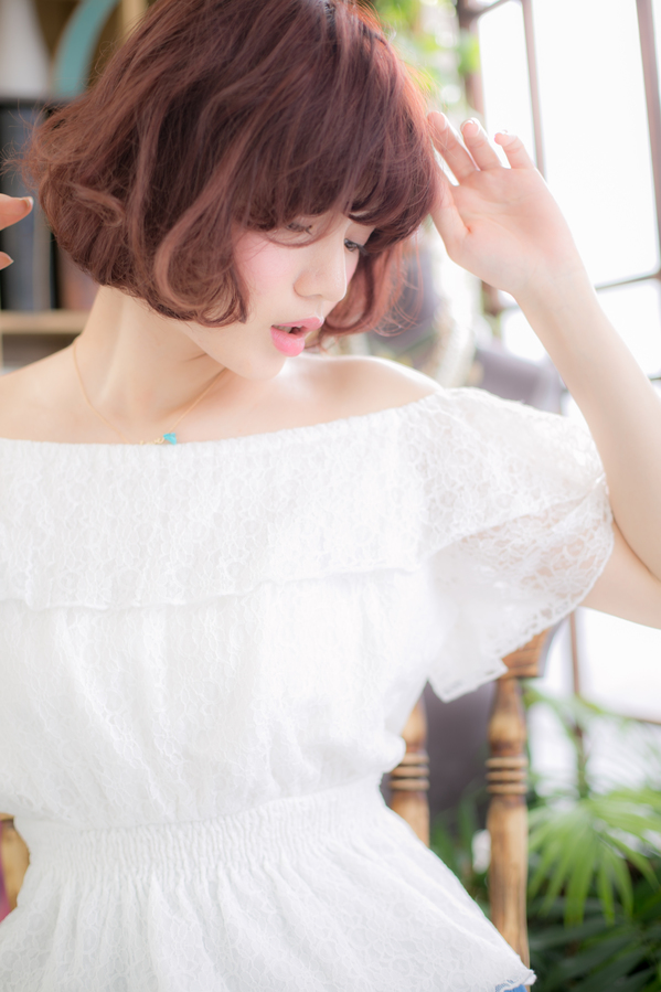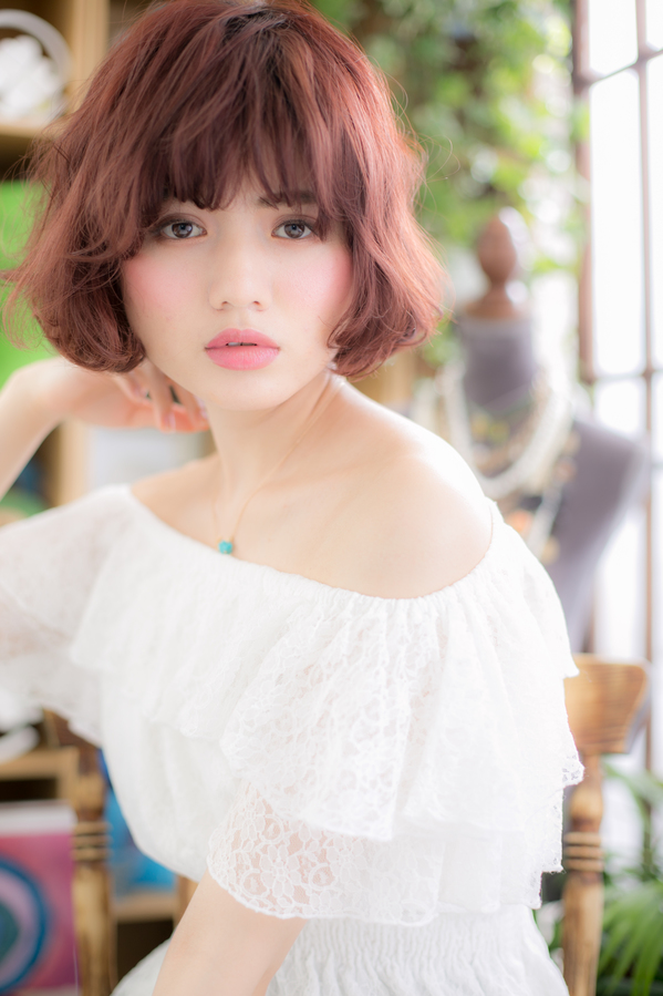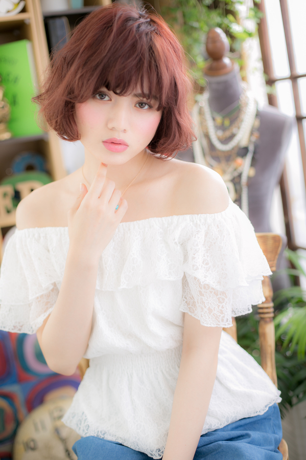 目力UPの長めバングとゆるふわカールがカワイイウェーブボブスタイル。レッド系カラーをオンすれば、周囲と差の付く個性的なガーリーボブに。おしゃれ偏差値急上昇です。グラデーションカラーや3Dカラーも立体感あって◎!