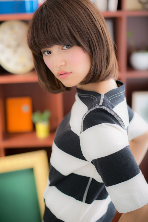 ナチュラルボブのピュアな可愛さと、ダークトーンのカラーが絶妙な甘辛スタイル☆厚めの前髪が小顔効果もUPさせまとまりある艶やかな質感がポイント。ぱっつんバングが印象的なスタイル♪