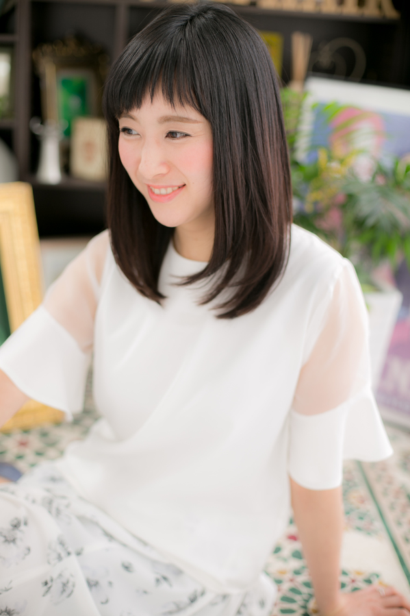 重めの黒髪スタイルも、短めの斜めにカットした前髪とツヤ感のあるストレートパーマでボリュームをダウンしているので重く見えません。カジュアルさもプラスのスタイルです。