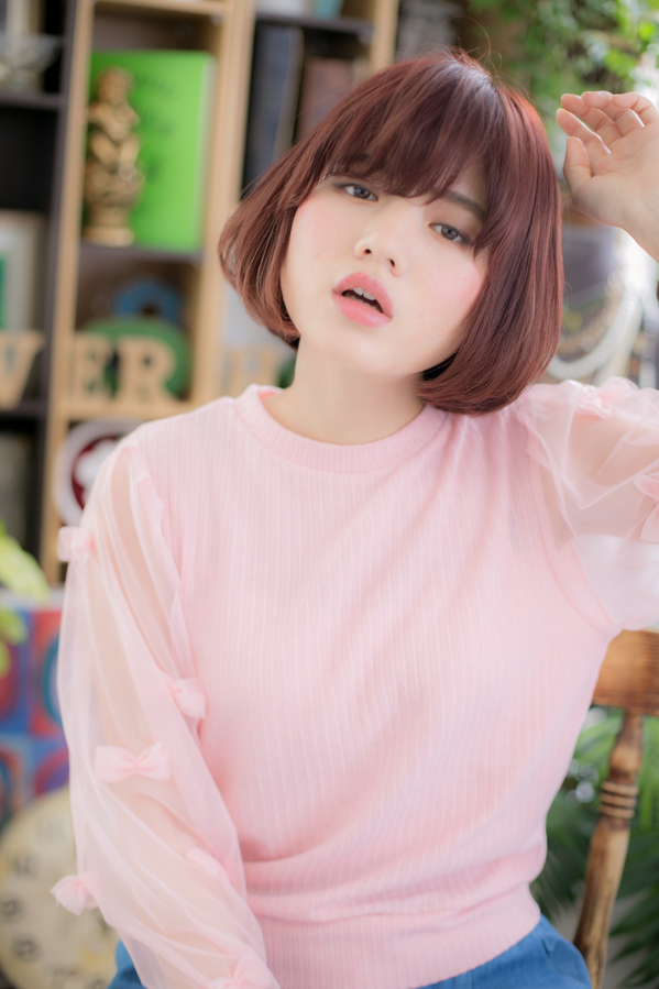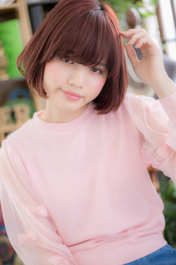 ナチュラルなボブスタイルにレッド、ピンク系のカラーで個性をプラス☆前髪も目の上ギリギリラインで目力もUPさせます♪広がりやすい方はナチュラルストレートをかけると◎