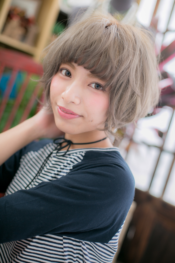 個性の映える攻めカラーがポイントのオシャレボブ。眉がチラ見えするショートバングと柔らかウェーブのかかったガーリーなボブスタイルに、思いっきり明るいアッシュカラーをオン。クールなショートスタイルにヘアチェンジ☆