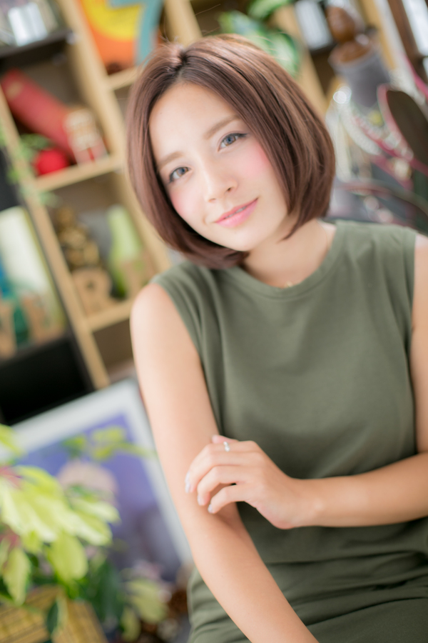 フェイスラインをカバーして小顔も狙えるナチュラルなシンプルボブ。少しピンクかかったナチュラルカラーでアクセントを♪飽きのこない人気スタイルです。