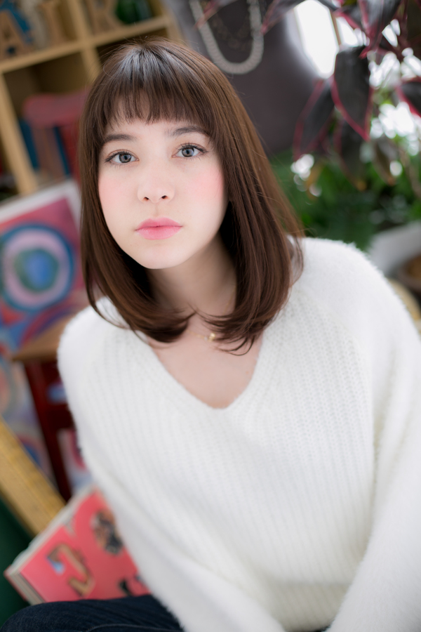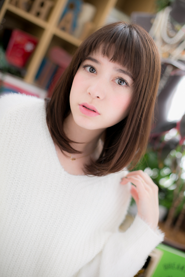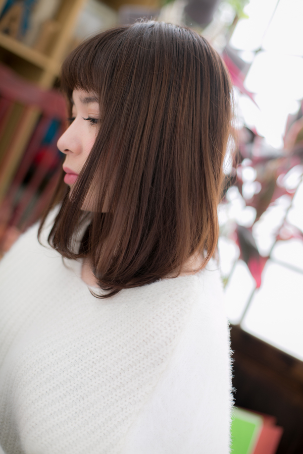 シンプルなミディアムストレートスタイルに短めのバングでアクセントを☆ダークトーンカラーが魅惑的で印象的なイメージに。