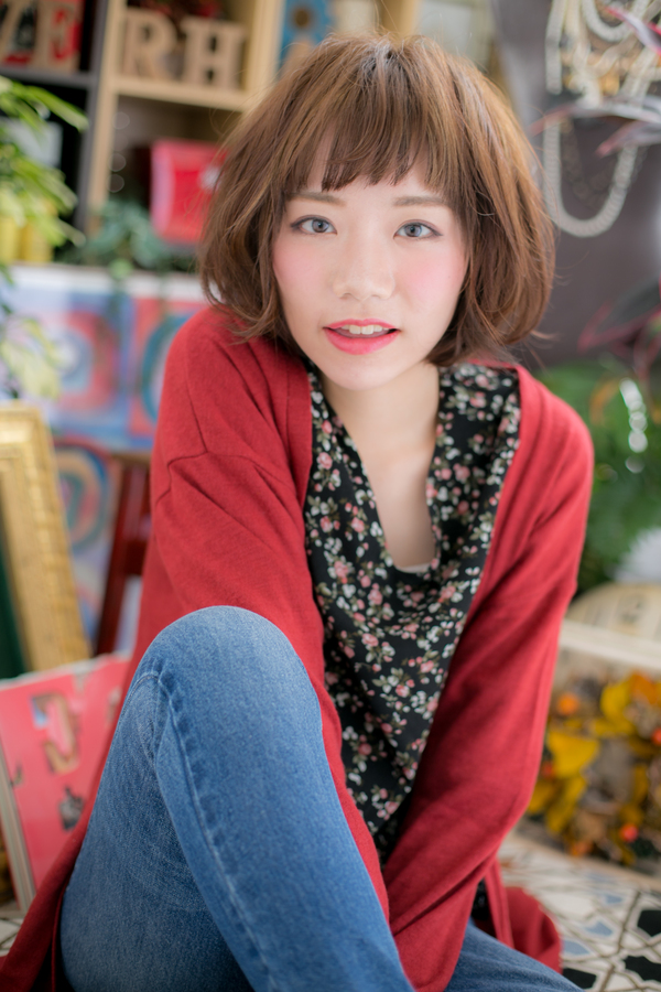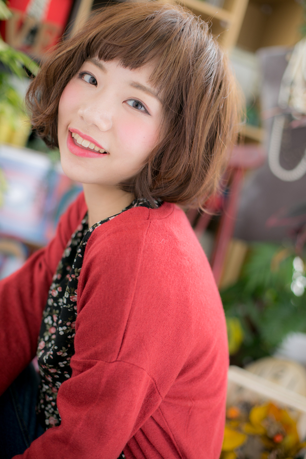 短めバングと、ローライトの入ったグラデカラーがカジュアルなガーリースタイルに♪いつものボブスタイルに変化をつけたい時はグラデカラーやアクセントカラーがオススメです。くせ毛の方はパーマ無しでもOKなニュアンスパーマが丸みをプラスしてくれます。