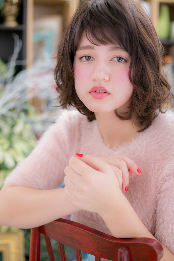 頬にかかるカールがやわらかな印象を醸すフェミニンボブ。高めの位置からパーマをかけることで、軽くてエアリーなゆるふわ感を演出します。