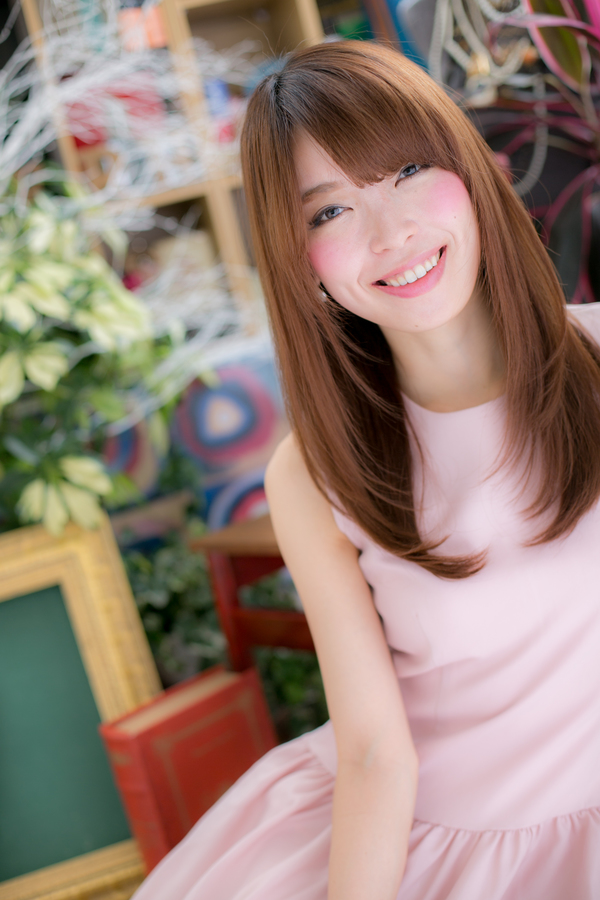 目のラインぎりぎりのバングとサラツヤストレートのテッパンモテスタイル毛先のレイヤーで軽やかにして、ピンク系やオレンジ系の明るいカラーでラブガーリーに決めれば、重めスタイルにならずしっとりまとまります。顔周りも華やかに。