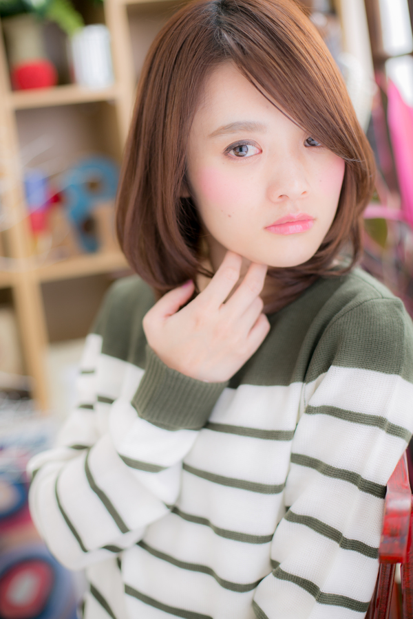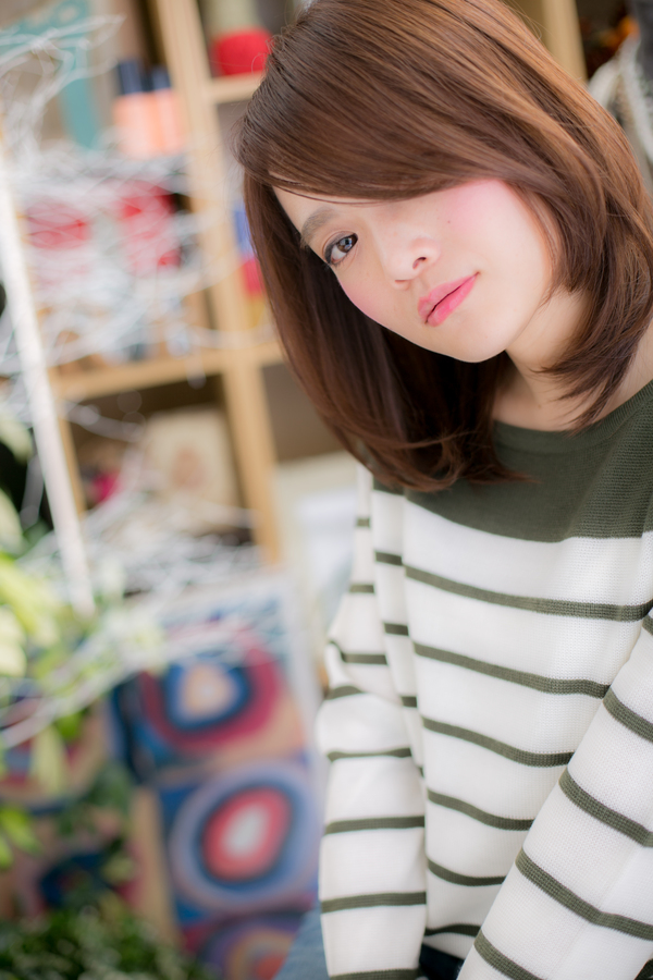 顔だちを綺麗に見せてくれるひし形フォルム。サイドに流した斜めバングは、シンプルながらも艶っぽくてGOOD。ツヤカラーで肌色を明るく毛先のレイヤーで軽やかに見せて、上品な清潔感をKEEP!