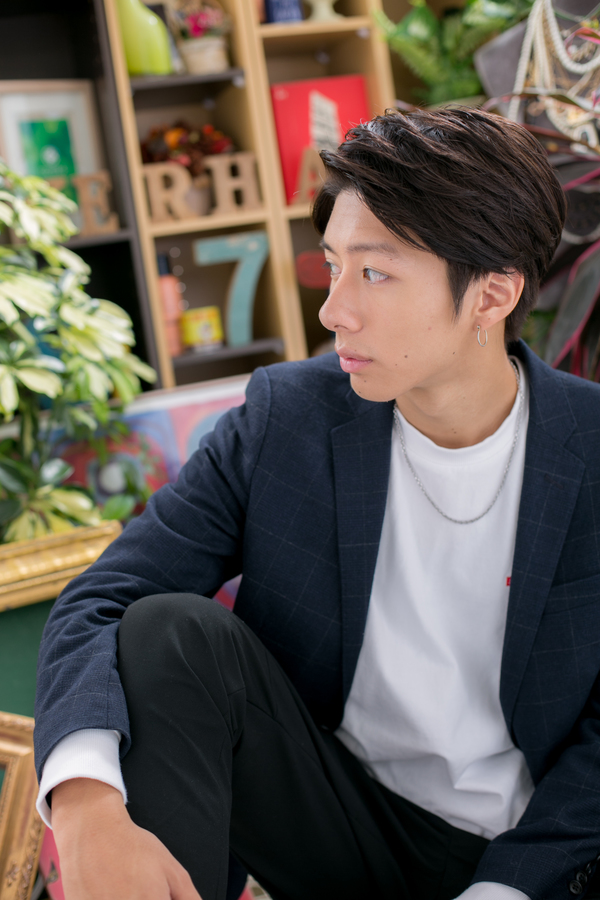 髪がウェット(濡れている)状態でジェルを全体的につけて、そのまま自然乾燥でOK。軽くワックスでサイドパートにセットしたスタイリングなど、シーンに合わせてスタイリング。