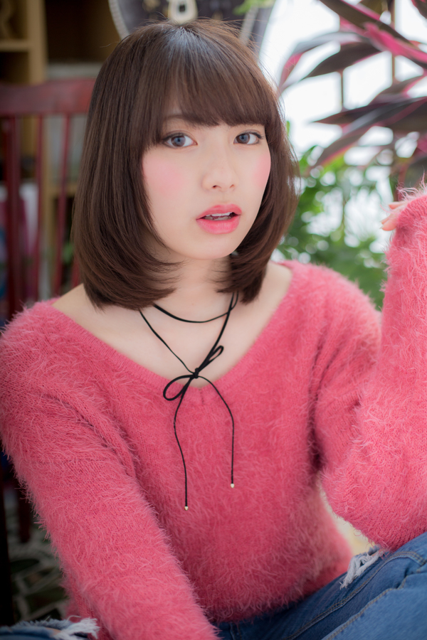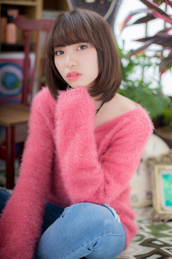 印象的なブラウン系の暗めカラーとぱっつんバングでぐんと存在感もUP!内巻きにまとまりやすくカットもされているのでハネにくくセットもしやすいです☆