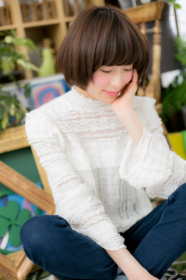 コロンとしたワンカールの丸みあるフォルムがキュートで個性的なラブガーリーボブ。ツヤカラーでさわやかな好感スタイルに。耳横にボリュームを持たせて小顔に見せて。厚めバングで目力UP!(メイク担当:北浦和店 棟方)