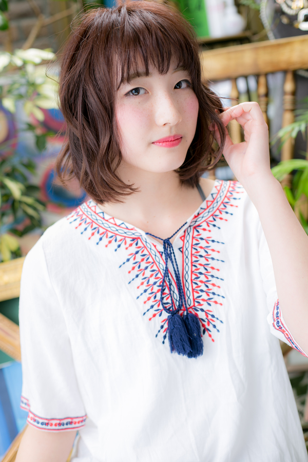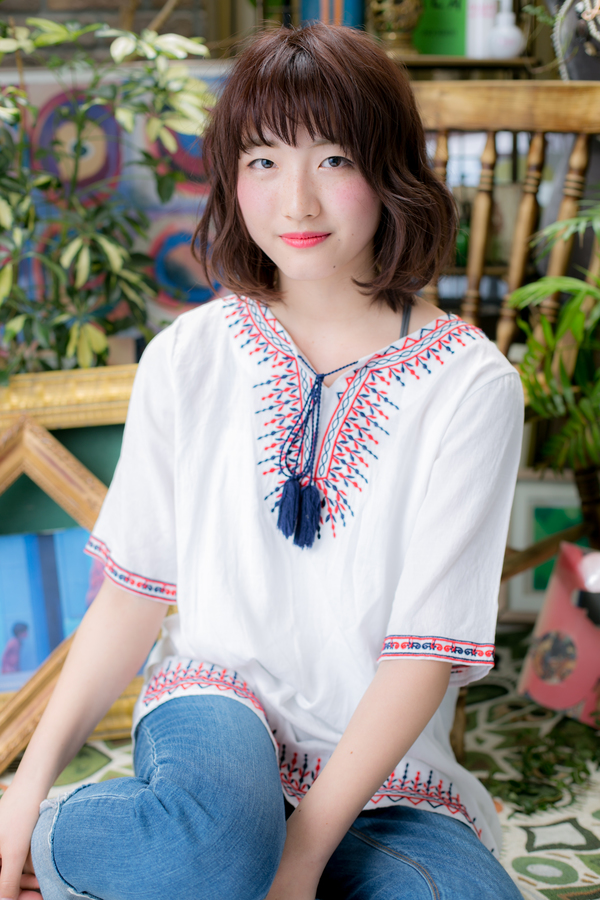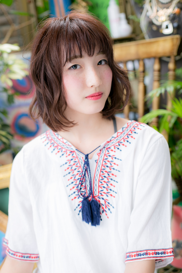 ベースはワンカール。MIXでカールを表面に入れて、ふわっとした感じとゆるい感じにしました。外ハネとカールを組み合わせたスタイルです。透け感あるフリンジバングでキュートに。