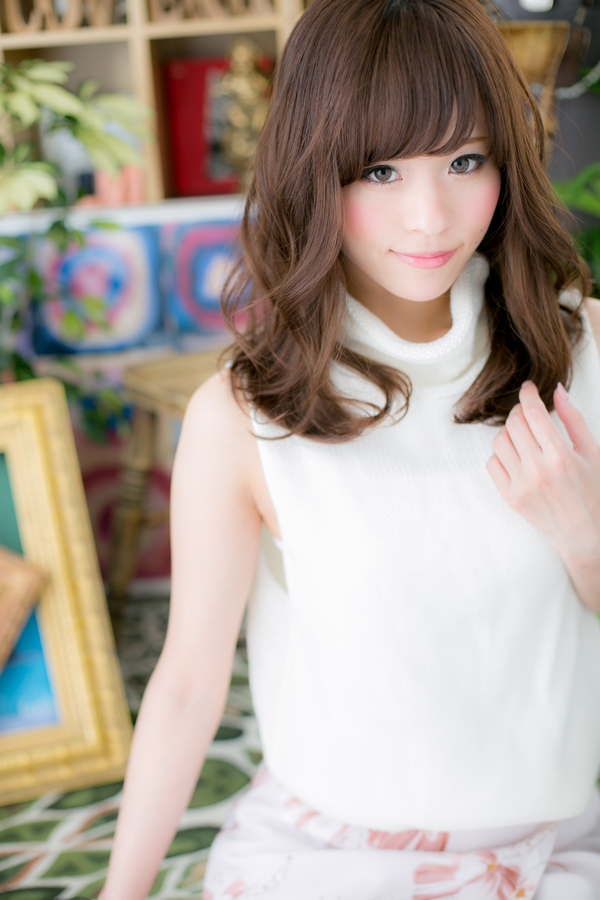 透け感ある斜めバングと耳横からリズミカルになびくエアリーカールで、ゆらぎ感あるモテ髪に。目元を強調して目力UPそ、サイドの毛流れで小顔見せもバッチリ。姫カットや耳かけでアクセントをつけても個性的でカワイイ♪