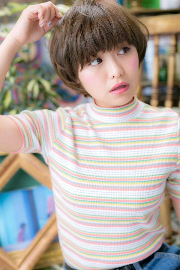 スッキリコンパクトフォルムのマッシュショート。小頭に見せて、スタイルアップ効果を狙い亜ます。ワンカールでやわらかな印象に。ワイドバングと合わせて目力UP効果も。可愛く見せてくれるガーリーショートです。