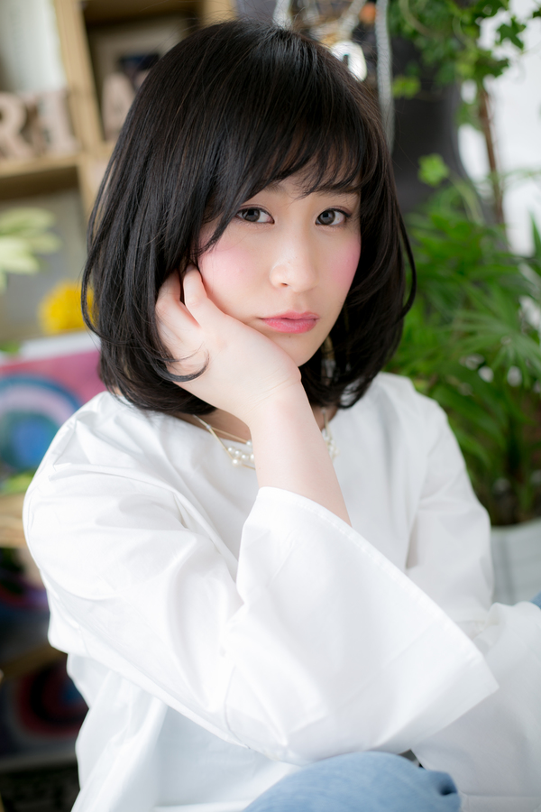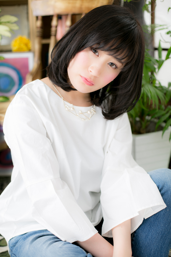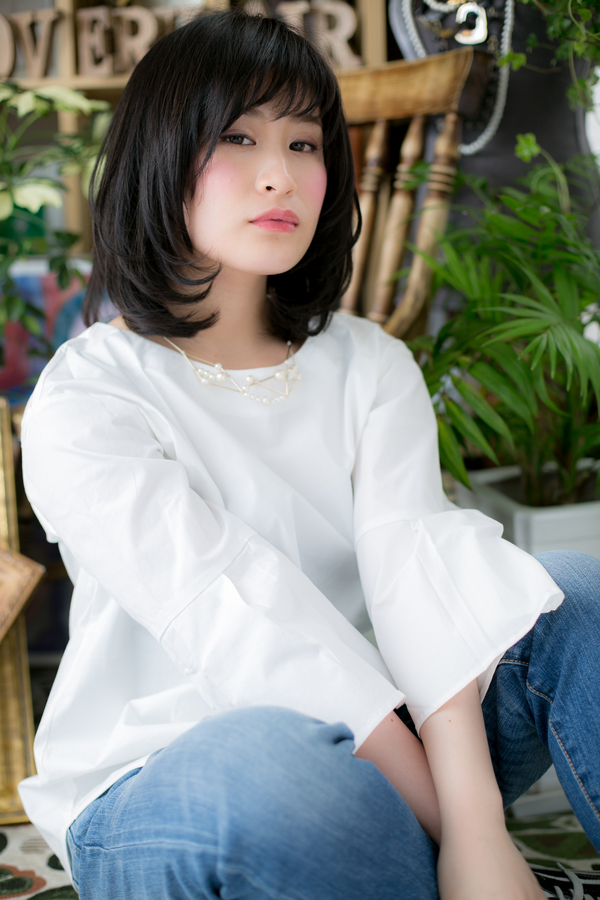 輪郭に沿ってくるんと丸めたワンカールで、フェイスラインをカバーして小顔見せ。斜めバングと黒髪で目元を強調して目力UP!大人かわいい雰囲気に中に、凛としたオーラをプラス。ニュアンスカールで動きをだしても◎ヒアルロン酸カラーは白髪にも対応可。