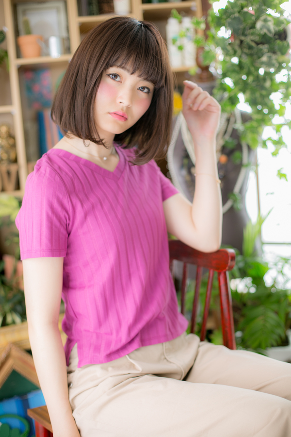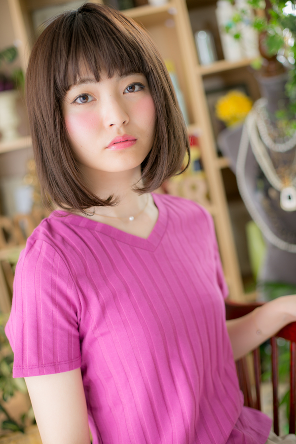 目元を印象つけるワイドバングで目力UP!顔周りを包み込む前下がりのラインで、フェイスラインをカバーして小顔に見せます。耳かけでガーリーにしても大人かわいい。洗い流さないトリートメントやオイルで保湿をしっかりと。