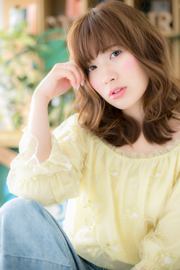 頬から丸みをつけるようにレイヤーを入れ、エアリーカールでふわふわ質感に仕上げたニュアンスミディ。透け感バングでフェミニンに、揺らめくカールで愛されスタイルに♪ベージュカラーやオレンジベージュで華やかに☆