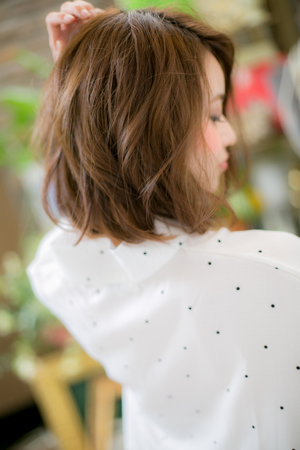 ルーズで無造作にざっくり分け目をつけて、軽くスタイリング剤をオンするだけ。ウェーブはスタイリング剤の質感でチェンジ。