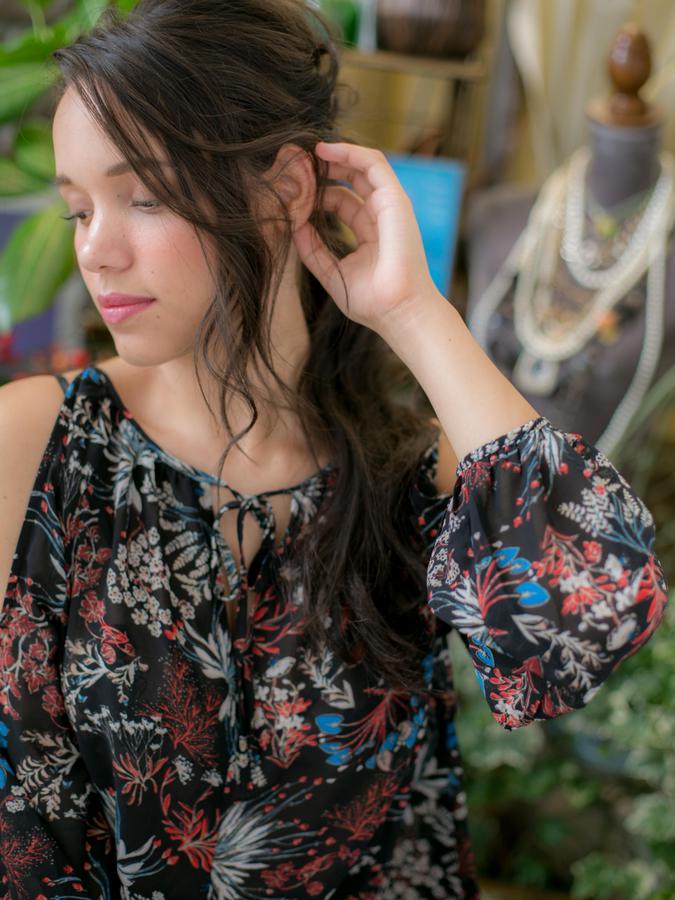 サイドのおくれ毛を残し、ラフにまとめたハーフアップスタイル。無造作だけど色っぽい、余裕ある大人の女性の抜け感スタイル。