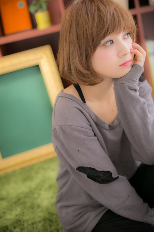 重めシルエットのボブベースにレイヤーを入れて動きを。毛先にエアリーカールをつけて柔らかな表情に☆気になる顔型もカバーしてくれます!厚め&長めの前髪が、大人かわいい印象に。