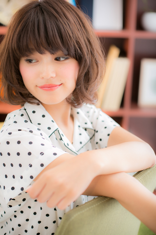 ひし形フォルムで空気を含んだゆるカールが軽やかなふわふわミディ♪適度なルーズ感の中に、厚めバングで可愛さをプラス。