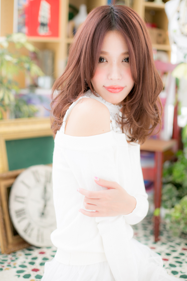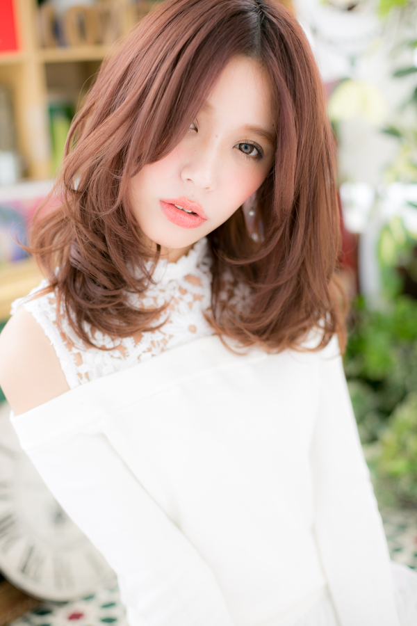 レッド系カラーとセンターパートで個性的に仕上げたグラマラスセミディなヘアスタイル。ノーバングでスッキリと、前下がりの毛流れで輪郭カバーして小顔にメイクで大人女子のファション度UP☆。斜めバングや厚めバングもフェミニンでヘアアレンジ☆トリートメントしたようなカラーリングで髪の悩みも解決する人気のカラーやピンク系のもおすすめ!30代・40代にも◎(メイク担当:北浦和店 棟方)