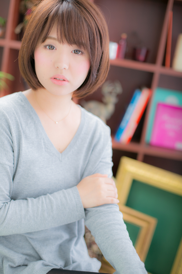 あごのラインの前下がりボブベースにカット。量感を調整しながら、丸みあるシルエットを作り、柔らかい質感に。毛先のワンカールでラブなスタイル♪耳かけ、斜めバングや厚めバングのアレンジ、ナチュラルボブ、フェミニンボブ、リラックスボブも旬。