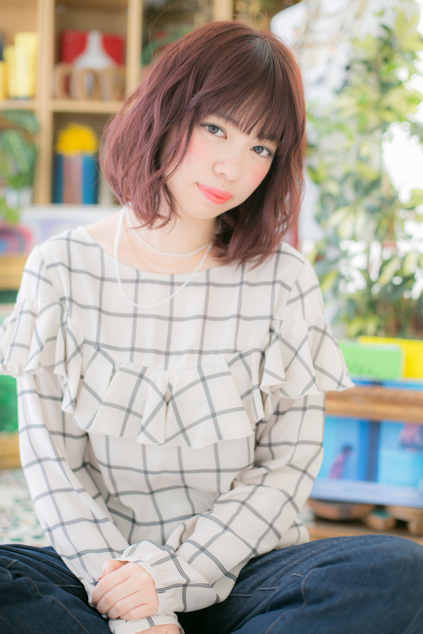 レッド系ピンク系カラーでガーリーに仕上げたくせ毛風ふわミディ。透け感ある斜めバングや厚めバングで目元を印象つけて大人女子のコーデを完成!耳かけも大人かわいい♪ミディアムヘアを際立たせるグラデーションでトリートメントしたようなカラーリングや髪の毛の悩みも解決!人気のカラーやアッシュも◎30代・40代にもおすすめ!(メイク担当:北浦和店 棟方)
