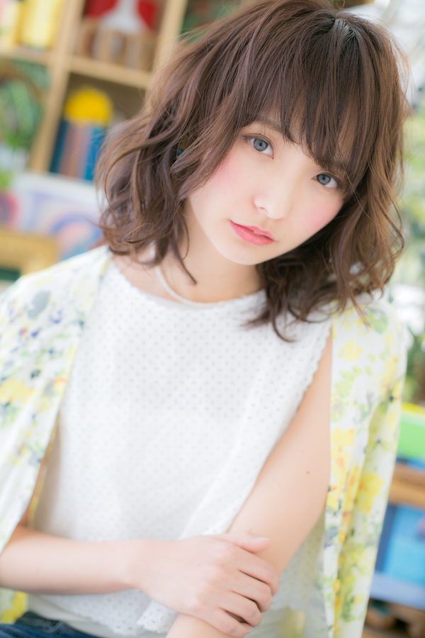 耳横でボリュームを持たせてAラインシルエットに仕上げた、くせ毛風ふわミディ。前下がりで小顔に見せて、斜めバングで目力UP!美人度上がるスタイルは、耳かけや厚めバングで大人かわいい印象にしてもOK。