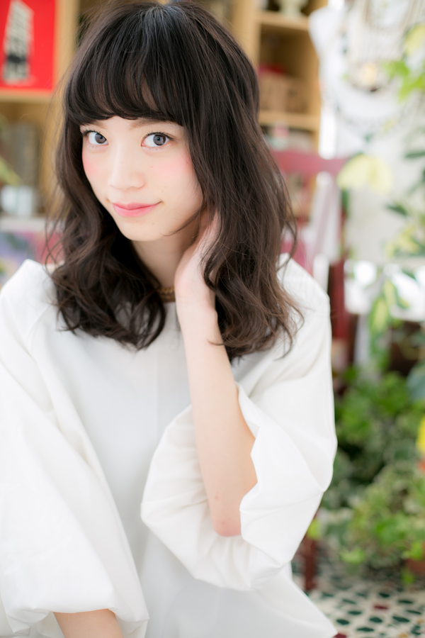 厚めバングで目元を印象付けたふわミディのヘアスタイル。落ち着いた黒髪で大人かわいい雰囲気で大人女子のファション度UP。前下がりでクールにしたり、耳かけや斜めバングでガーリーにしてヘアアレンジ。小顔効果もバッチリです。トリートメントしたようなカラーリングで髪の毛の悩みも解決!30代・40にもおすすめ!(メイク担当:川口店 成田)