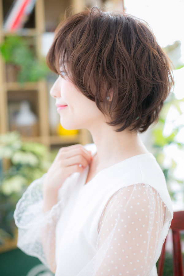 トップふんわり&くせ毛風パーマで耳横にボリュームを持たせた大人女子のファッション度UP。ひし形シルエットの小顔フェミニンボブ。ナチュラルボブや前下がりボブからのヘアアレンジにおすすめ。トリートメントしたようなカラーリングで髪の毛の悩みも解決!30代・40代にも◎(メイク担当:北浦和店 棟方)