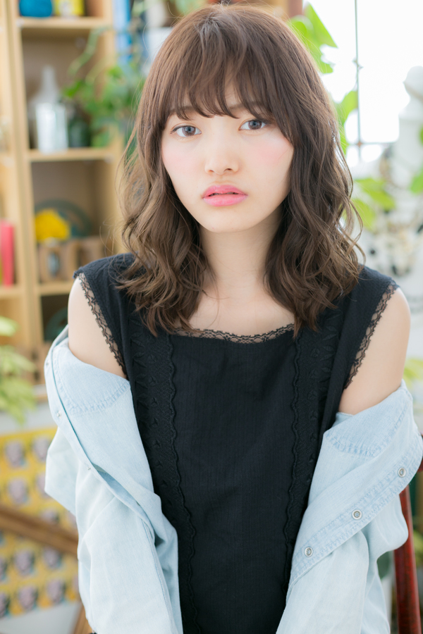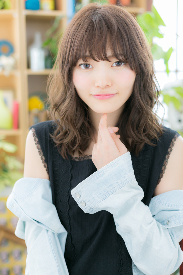 透け感ある長めバングで目元を印象つけたくせ毛風パーマのふわミディ。耳横でふわっと広がるひし形シルエットで小顔にメイク。耳かけしたり、斜めバングや厚めバングも大人かわいい。トリートメントしたようなカラーリングで髪の毛の悩みも解決!30代・40代にもおすすめ!(メイク担当:北浦和店 棟方)