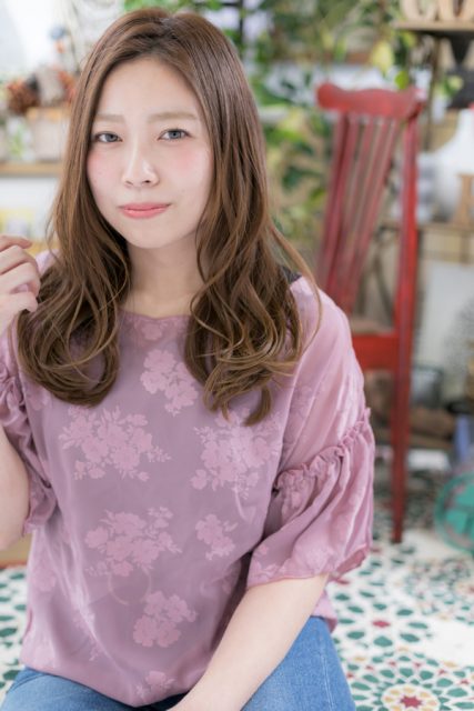 重めスタイルになりがちな暗髪ロングは、くせ毛風ゆるやかなパーマでふわっとやわらかさを出して重軽スタイルで大人女子のファッション度UP。外国人風のツヤカラーで透明感を演出。トリートメントしたようなカラーリングで髪の毛の悩みも解決!30代・40代にもおすすめ!
