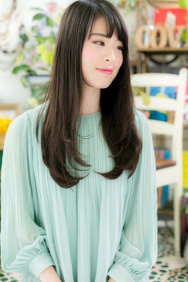 レイヤーを入れて軽さを演出したロングのヘアスタイル。乾かすだけの簡単スタイリングで決まる、好感度大の黒髪ワンカールで大人女子のファッション度UP。髪の毛の色は暗めのグラデーション髪の毛の悩みも解決する人気のカラー、アッシュグレー、ブリーチなしもおすすめ!30代・40代にも◎