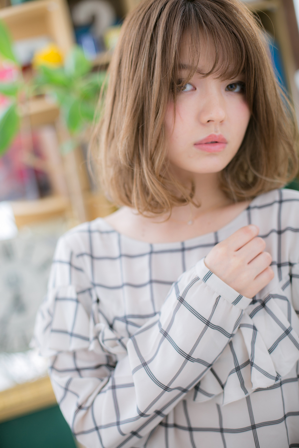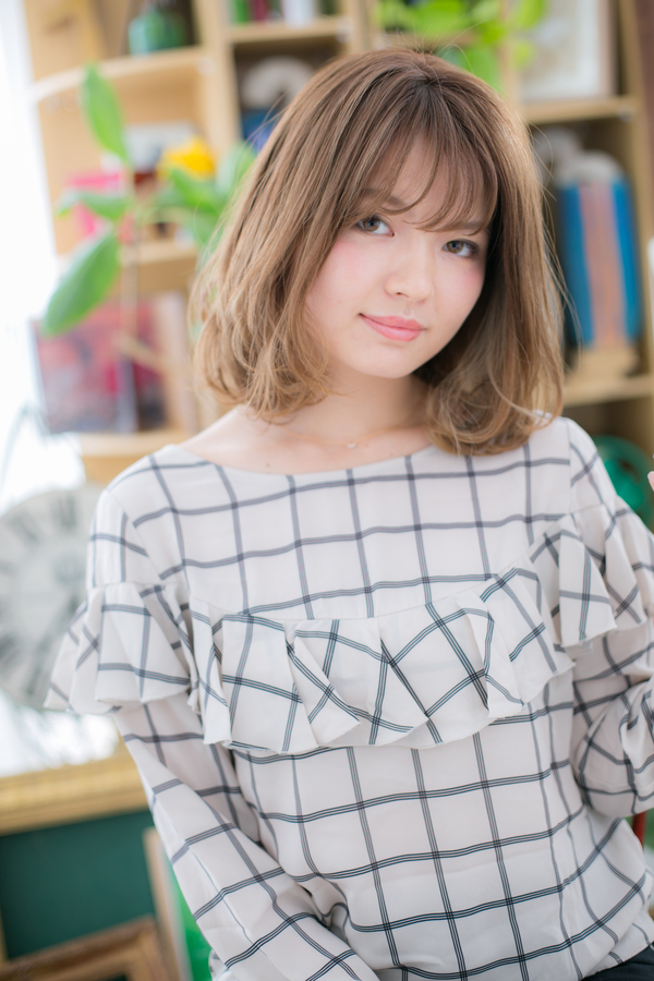 パッと目を引くハイトーンのグラデーションカラーで友達をリード!くせ毛風パーマとシースルーバングがフェミニンなふわミディ。前下がりで輪郭カバーして小顔見せで大人女子のファッション度UP。トリートメントしたようなカラーリングで髪の毛の悩みも解決!人気のカラーやピンク系のカラーもおすすめ!30代・40代にも◎(メイク担当:川口店 成田)