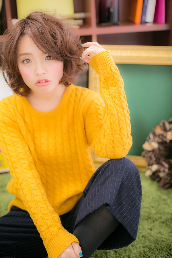 くしゃっとした無造作感がカワイイ♪遊ぶ心あふれる、くせ毛風のドーリーカールヘア。ボブにレイヤーの入った重めスタイルも、暖かみのあるカラーとふわっふわパーマをプラスすれば、動きのあるポップなラブスタイルに☆普通のボブに飽きた方にオススメ!