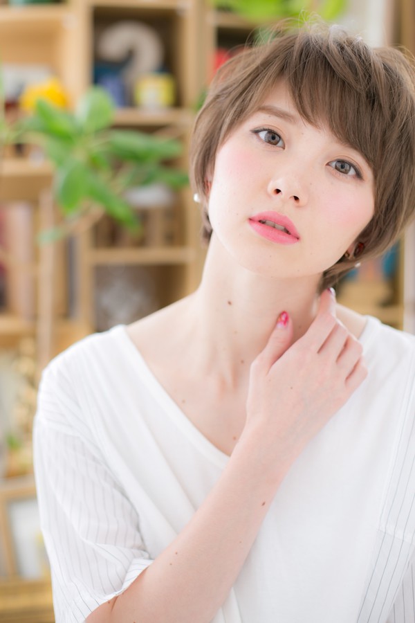 斜めバング&厚めバングで目力強調&前下がりで小顔に仕上げたフェミニンアシメショート。デートでもオフィスでもウケバッチリのモテヘアスタイルで大人女子のコーデを完成。くせ毛風パーマや耳かけも大人かわいい。トリートメントしたようなカラーリングで髪の毛の悩み解決!人気のカラーのカラーやアッシュグレー、ブリーチなしもおすすめ!30代・40代にも◎(メイク担当:川口店 成田)