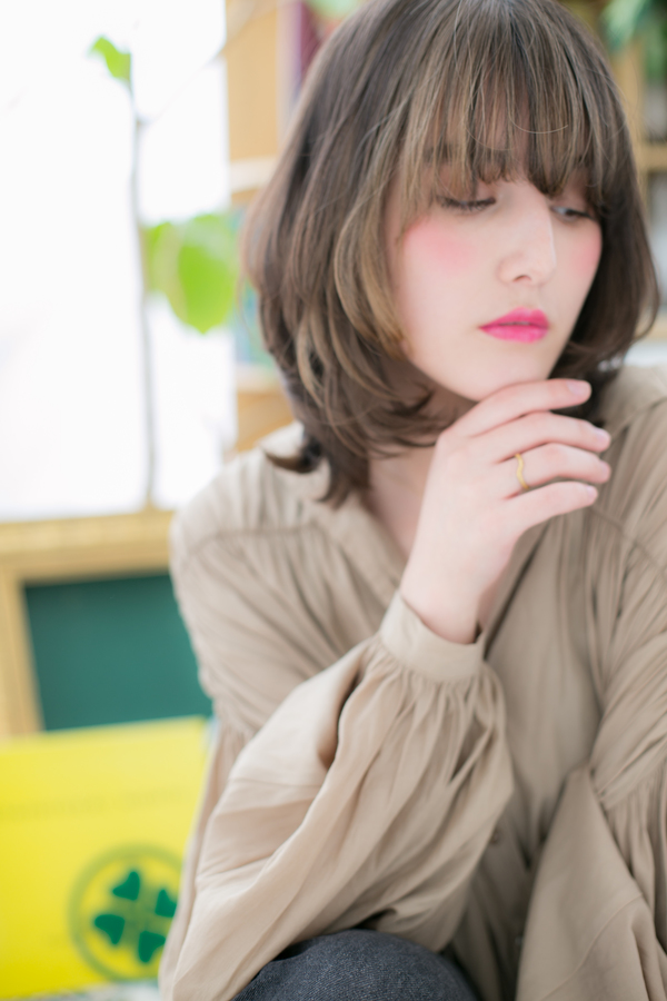 長めにセットした斜めバングで目力UPのヘアスタイル。抜け感ラフミディは前下がりで小顔に見せて大人女子のコーデを完成。耳かけや厚めバングも大人かわいいヘアアレンジ。ミディアムヘアが際立たせるグラデーションやベージュで髪の毛の悩みも解決!30代・40代にもおすすめ!(メイク担当:川口店 成田)