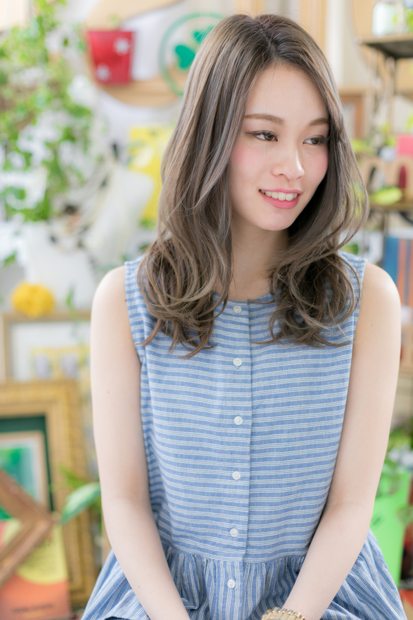大きめウェーブが女っぽさ満点のふわミディロング。ほつれたような自然な質感のヘアスタイルは低温保湿パーマで。無造作カールで外国人風の抜け感を出したり、大人女子のコーデを完成!髪の色は暗めのグラデーションやベージュもおすすめ。40代のエラ張り対策にも◎