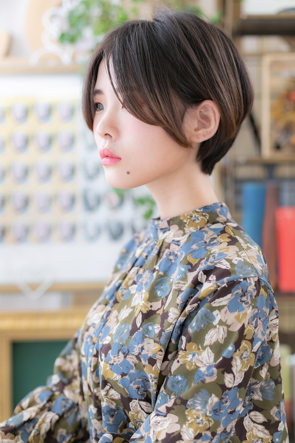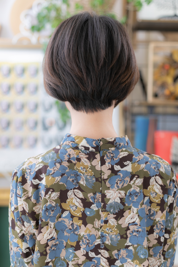 王道ひし形ショートで好感度UP!センターパートで大人っぽく。ショート初心者の方にもGOOD。前下がりで小顔にしたり、耳かけやアシンメトリーなヘアアレンジで大人女子のコーデを完成。トリートメントしたようなカラーリングで髪の毛の悩みも解決!人気のカラーやグラデーション、ベージュの暗めの髪の毛の色もおすすめ!40代の人気のヘアスタイルです。(メイク担当:北浦和店 今野)