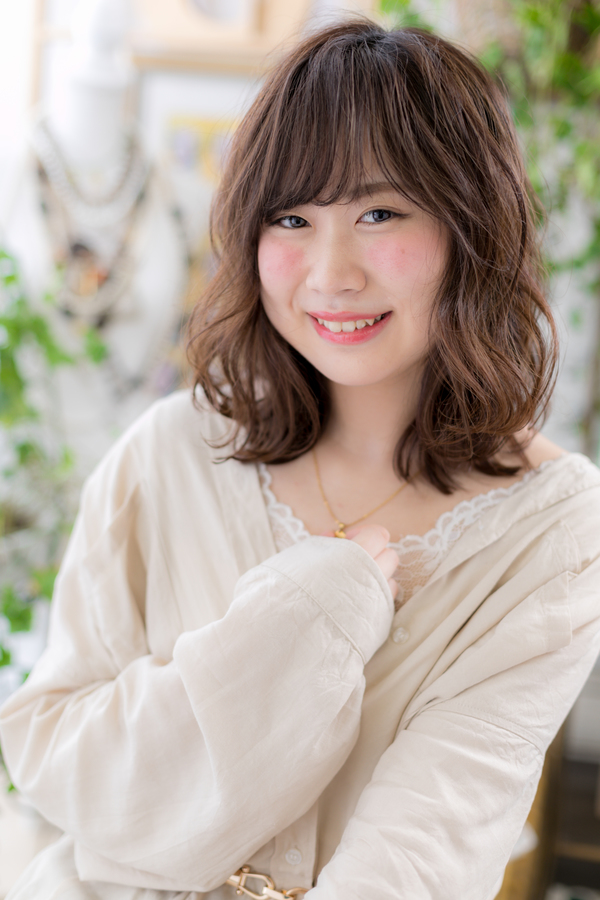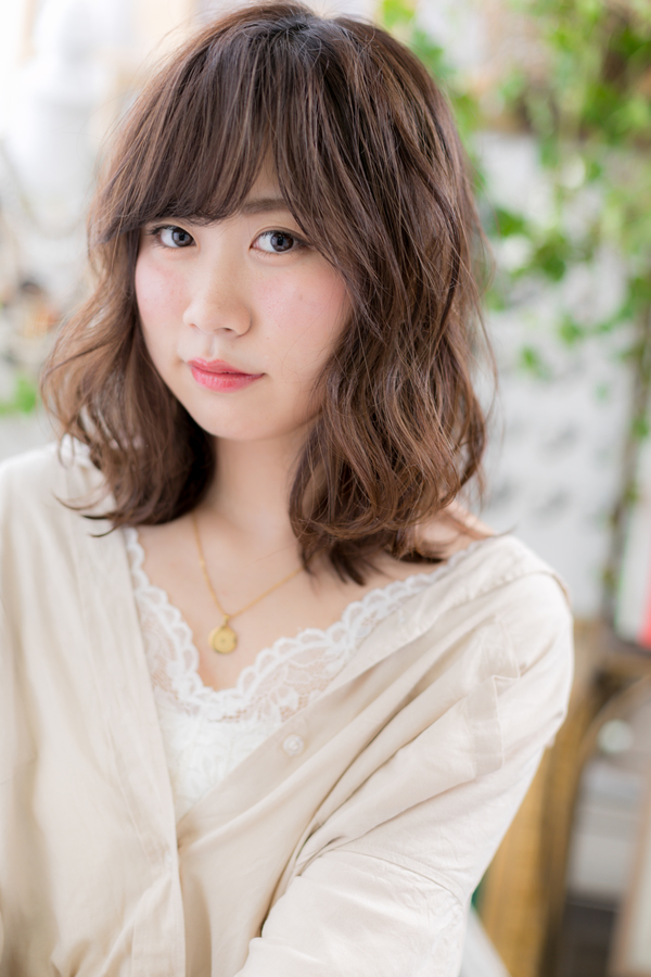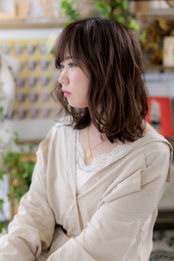 全体にハイライトを入れて透明感を。大きなくせ毛風パーマで軽さとやわらかさをプラスで大人女子のファッション度UP。ミディアムヘアを際立たせるグラデーションやベージュで暗めの髪の色もおすすめ!30代・40代にも◎(メイク担当:北浦和店 棟方)
