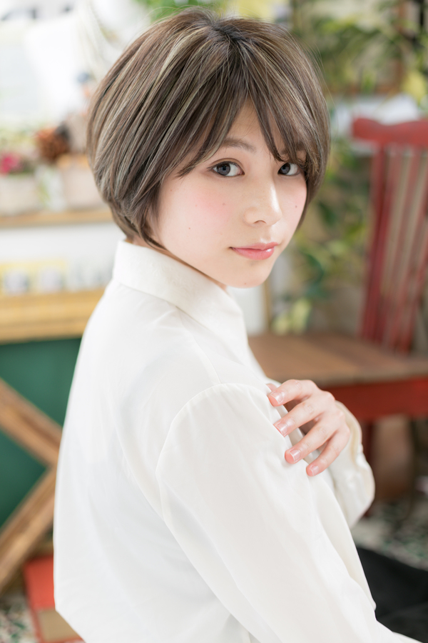 小顔見せ効果大のショートのヘアスタイル。目の上ギリギリのシースルーバングでトレンド感と目力UPで大人女子のファッション度UP!髪の毛の悩みを解決する人気のカラーやアッシュグレー、グレージュ。ブリーチなしもおすすめ!40代にも人気!(メイク担当:北浦和店 棟方)
