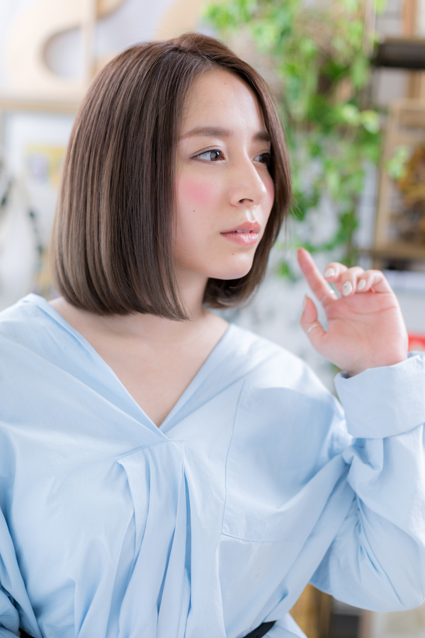 ツヤと透明感溢れるワンレンナチュラルボブのヘアスタイル。前下がりで小顔見せ効果で大人女子のコーデも完成。耳かけしたり、斜めバングや厚めバングで目力UPしてもGOOD。ミディアムヘアを際立たせるグラデーションやベージュの暗めの髪の色もおすすめ。30代・40代にも◎(メイク担当:川口店 成田)